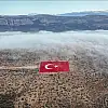 İlçeye bağlı dağlık bölgede bulunan ve 22 dönümlük alana işlenen, Dronla görüntülenen 21 bin 600 metrekarelik dev Türk bayrağı da sisle birlikte eşsiz bir görünüme büründü.