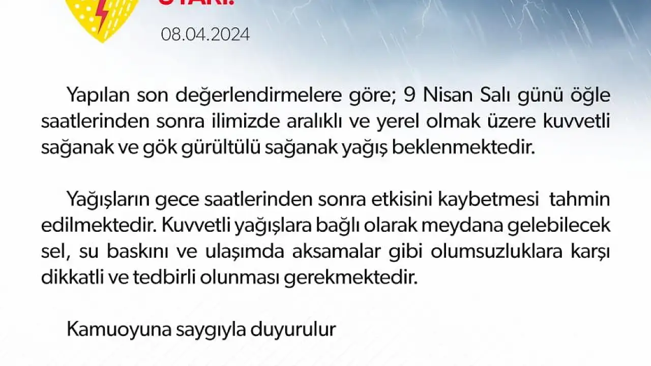 Meteoroloji Genel Müdürlüğü, Şanlıurfa’da şiddetli yağış, su baskını ve sel uyarısında bulundu. Uyarıda, “Yapılan son değerlendirmelere göre 9 Nisan Salı günü öğle saatlerinden sonra ilimizde aralıklı ve yerel olmak üzere kuvvetli sağanak ve gök gürültülü sağanak yağış beklenmektedir. Yağışların gece saatlerinden sonra etkisini kaybetmesi tahmin edilmektedir. Kuvvetli yağışlara bağlı olarak meydana gelebilecek sel, su baskını ve ulaşımda aksamalar gibi olumsuzluklar karşı dikkatli ve tedbirli olunması gerekmektedir" denildi.