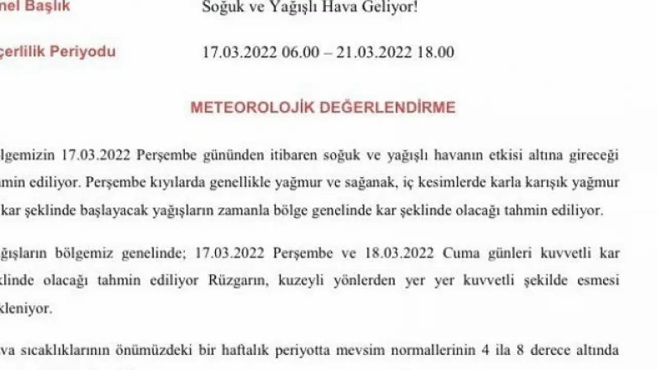 “Bölgemizin 17 Mart Perşembe gününden itibaren soğuk ve yağışlı havanın etkisi altına gireceği tahmin ediliyor. Perşembe, kıyılarda genellikle yağmur ve sağanak, iç kesimlerde karla karışık yağmur ve kar şeklinde başlayacak yağışların zamanla bölge genelinde kar şeklinde olacağı tahmin ediliyor. Yağışların bölgemiz genelinde perşembe ve cuma günleri kuvvetli kar şeklinde olacağı tahmin ediliyor. Rüzgârın kuzeyli yönlerden yer yer kuvvetli şekilde esmesi bekleniyor.”