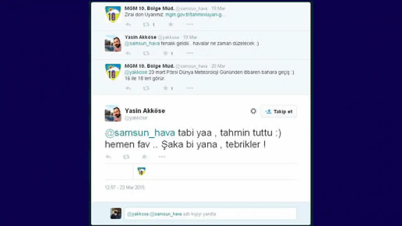 Vatandaşların kendilerini sosyal medyadan sıkı bir şekilde takip ettiklerini belirten Meteoroloji 10. Bölge Müdürü Murat Asar, “Vatandaşlarımız özellikle sosyal medyanın Türkiye’de çok hızlı yayılmasından ve etkin bir şekilde kullanılmasından dolayı sosyal medyadan da bizleri takip ediyorlar. Bizler Samsun Bölge Müdürlüğü olarak sosyal medya hesabımızdan vatandaşlarımızı elimizden geldiği kadar hızlı ve doğru bir şekilde bilgilendirmek için tahminlerimizi buradan yayınlıyoruz. Buradan çok enteresan twitler olabiliyor. Bize ‘yarın düğünüm var, hava nasıl olacak’ ya da ev hanımları ‘yarın çamaşır yıkayabilir miyim, çamaşır yıkamam için müsait gün ne gündür’ şeklinde twit atanlar oluyor. Hatta bu sene kışın biraz sert ve uzun geçmesinden dolayı vatandaşlarımız muhtemelen güneşi özlemiş olmalılar ki, ‘artı ne zaman bahar gelecek, sıkıldık, biran önce havalar açsın’ gibi enteresan paylaşımlarda da bulunuyorlar. Bizler de bu vatandaşlarımıza elimizden geldiğince en güvenilir ve doğru bilgiyi anında paylaşmaya çalışıyoruz” dedi.