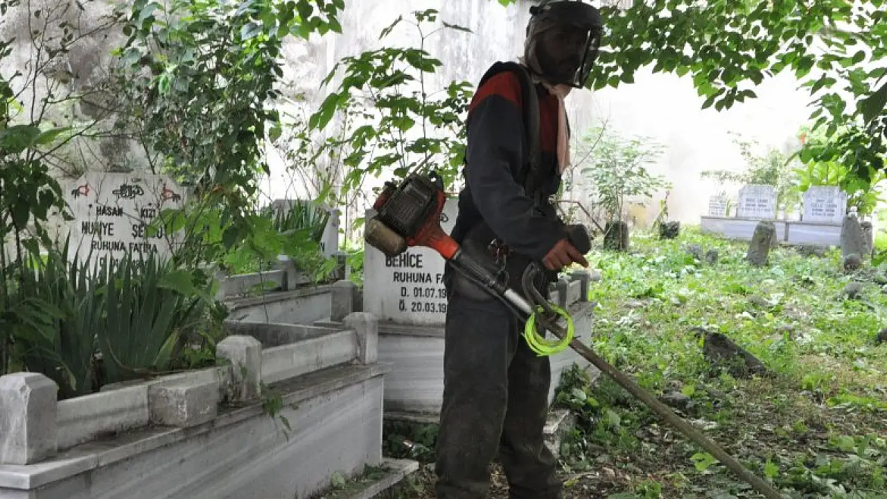 Bayrama özel yapılan çalışmada mezarlıkların içerisindeki yabani otlar temizlenirken, yürüyüş yolları ve ağaçların da bakımları gerçekleştirildi.