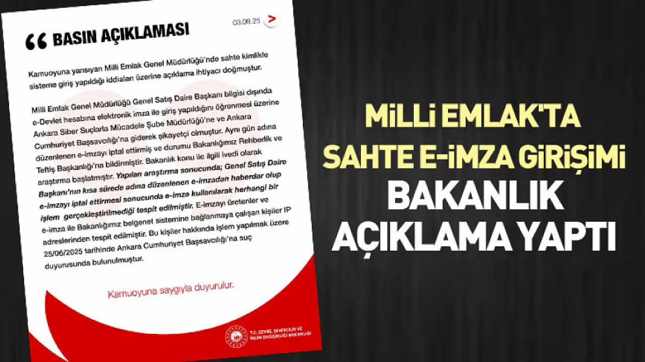 “Milli Emlak Genel Müdürlüğü Genel Satış Daire Başkanı bilgisi dışında e-Devlet hesabına elektronik imza ile giriş yapıldığını öğrenmesi üzerine Ankara Siber Suçlarla Mücadele Şube Müdürlüğü’ne ve Ankara Cumhuriyet Başsavcılığı’na giderek şikayetçi olmuştur. Aynı gün adına düzenlenen e-imzayı iptal ettirmiş ve durumu Bakanlığımız Rehberlik ve Teftiş Başkanlığı’na bildirmiştir. Bakanlık konu ile ilgili ivedi olarak araştırma başlatmıştır. Yapılan araştırma sonucunda; Genel Satış Daire Başkanı’nın kısa sürede adına düzenlenen e-imzadan haberdar olup e-imzayı iptal ettirmesi sonucunda e-imza kullanılarak herhangi bir işlem gerçekleştirilmediği tespit edilmiştir. E-imzayı üretenler ve e-imza ile Bakanlığımız belgenet sistemine bağlanmaya çalışan kişiler IP adreslerinden tespit edilmiştir. Bu kişiler hakkında işlem yapılmak üzere 25/06/2025 tarihinde Ankara Cumhuriyet Başsavcılığı’na suç duyurusunda bulunulmuştur.”