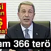 Milli Savunma Bakanı Hulusi Akar, son 45 gün içinde yurt içi ve sınır ötesine yapılan operasyonlarda elebaşları dahil toplam 366 teröristin etkisiz hale getirildiğini açıkladı.