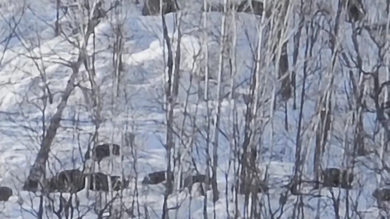 Tunceli'nin doğal güzellikleriyle öne çıkan Munzur Vadisi'nde, karlı dağlarda yiyecek arayan domuz sürüsü görüntülendi.
