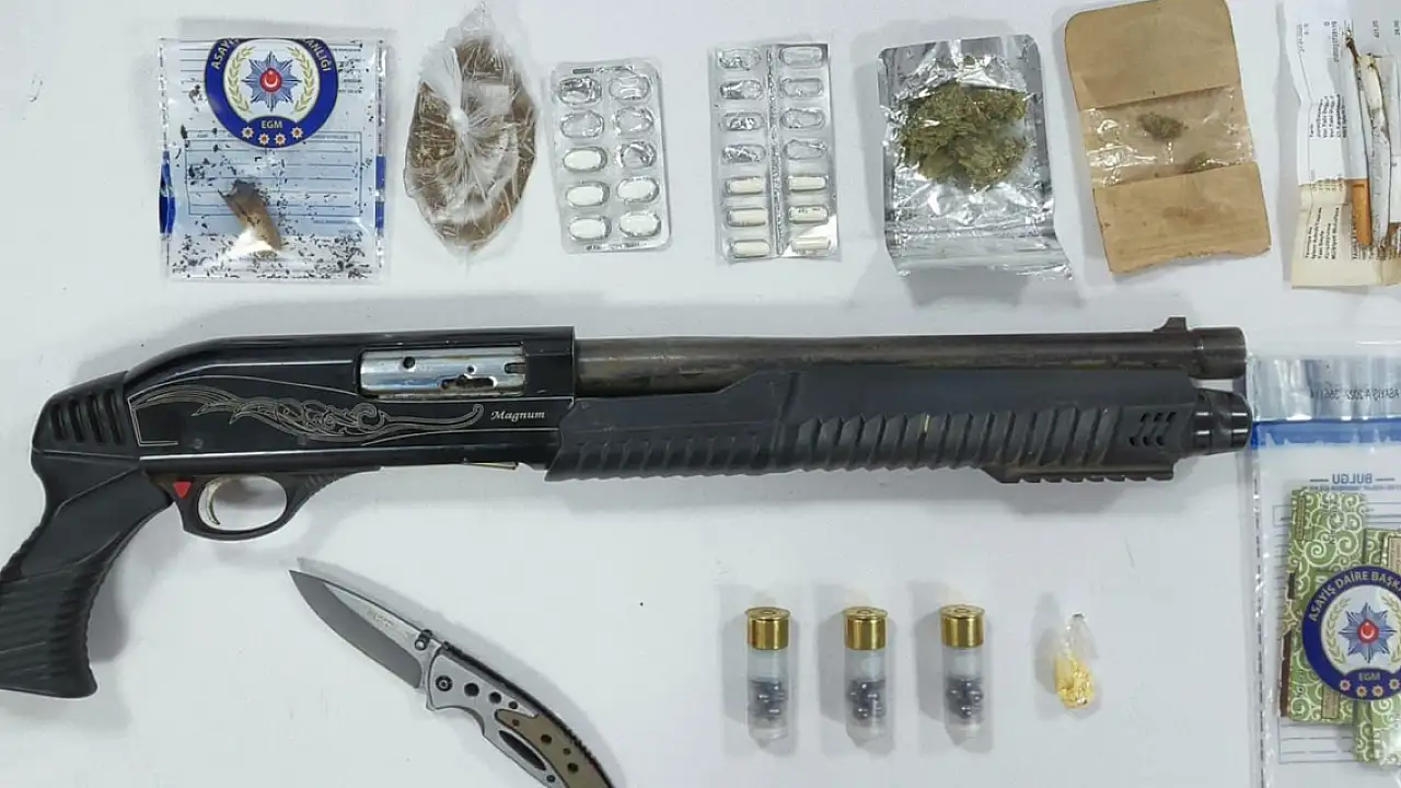 Araçta arama yapan ekipler, 20,2 gram sentetik uyuşturucu, 5 esrarlı sigara, 11 sentetik ecza hapı, ruhsatsız pompalı tüfek, 3 tüfek kartuşu ile bıçak buldu. Ekipler, araçtaki Y.A, S.S. ve Z.S'yi gözaltına aldı.