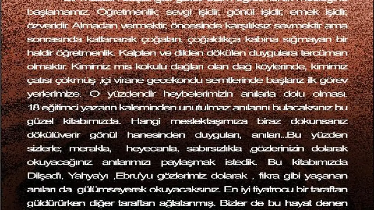 Konuyla ilgili bilgi veren öğretmen Murat Aksoy, öğretmen anıları kitabının Kasım ayında çıkan 7. serisini meslektaşlarına ithaf ettiklerini söyledi. Kitabın PDF olarak hazırlandığını belirten Aksoy, “Ekibimizde 7 bölgeden de öğretmen var. Ekip olarak böyle bir eseri ortaya koyduk. Tüm meslektaşlarımızın Öğretmenler Günü’nü kutluyoruz” dedi.
