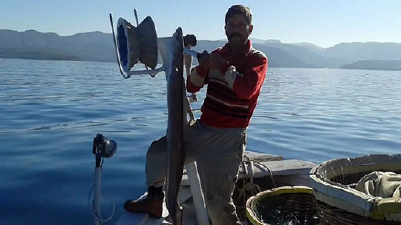 Muğla'nın Gökova Körfezi'nde balıkçıların oltasına 2,5 metre uzunluğunda 10 kilogram ağırlığında bir deniz yılan balığı(Mığrı) takıldı