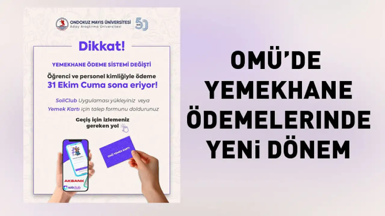 Yeni dönemde, yemekhane ödemeleri SoliClub mobil uygulaması veya OMÜ Yemek Kartı aracılığıyla yapılabilecek. Bu sistemle birlikte işlemlerin daha hızlı, güvenli ve pratik hale gelmesi hedefleniyor.
