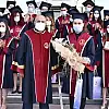 Fakülte birincisi Mert Ünal'ın Dekan Prof. Dr. Selim Arıcı ile birlikte mezuniyet kütüğüne plaket çakmasının ardından hekimlik yeminini eden 76 genç diş hekimi mezuniyet coşkusuyla keplerini fırlattı.