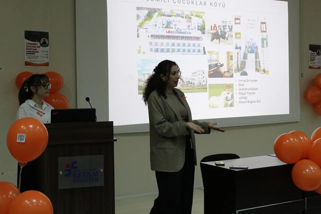 Seminerde LÖSEV’in yürüttüğü çalışmalar, gönüllülük faaliyetleri, Ankara’da bulunanLösemili Çocuklar Köyü, LÖSEV’in üniversitelerde lösemi ve kanser farkındalığını artırmayı amaçladığı FAYDAprojesinin amaçları hakkında bilgiler verildi. Sezgin, 2-8 Kasım Lösemili Çocuklar Haftası için kampüste yapılan çalışmalar ve her yerin turuncu olmasının sağlanarak umudu ve farkındalığı çoğaltma üzerinde durdu.