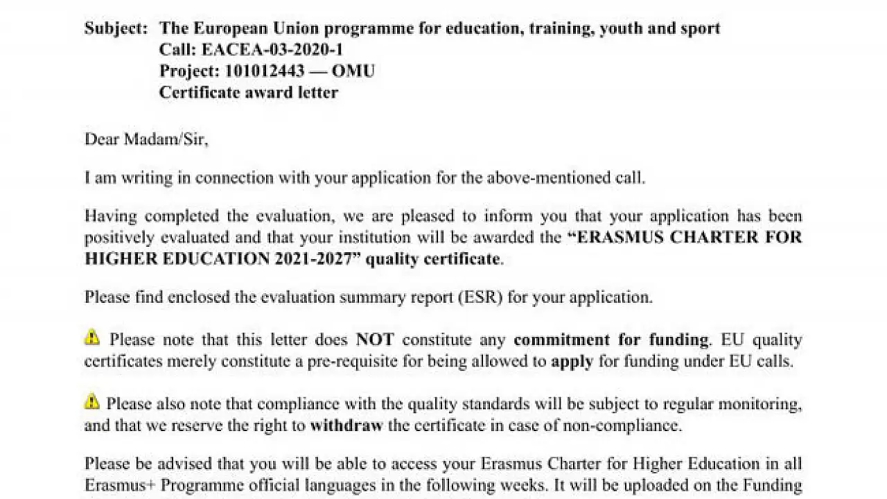 OMÜ proje başlangıcından günümüze başarılı bir şekilde yürüttüğü Avrupa Birliği (AB) destekli Erasmus Değişim Programı deneyimi ile bir kez daha Avrupa Birliği tarafından tam puan ile Erasmus Yükseköğrenim Beyannamesi (ECHE) 2021-2027 kalite sertifikası almaya hak kazandı. Uluslararası İlişkiler Birimi ve Erasmus Kurum Koordinatörlüğü'nün bugüne değin gerçekleştirdiği hareketlilik ve organizasyon başarısı sayesinde 100 tam puan alan OMÜ 2021-2027 dönemi için faaliyetlerine başarılarla devam edecek.