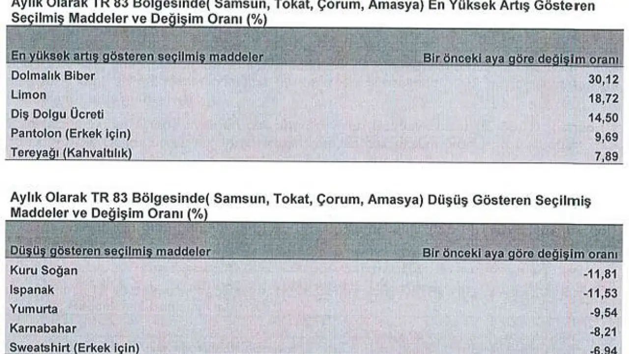 Samsun, Tokat, Çorum ve Amasya illerinde şubat ayında fiyatı en çok artan ürün dolmalık biber, en çok azalan ürün ise kuru soğan oldu. Bölgede fiyat değişimleri Türkiye genelini solladı.