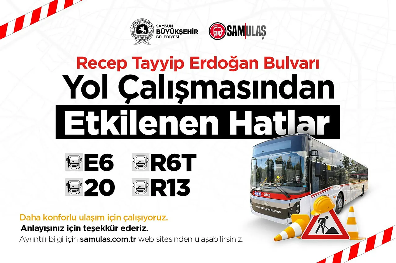 Samsun Büyükşehir Belediyesi tarafından kent içi trafiği rahatlatmak amacıyla şehrin ana ulaşım arterlerinden biri olan Recep Tayyip Erdoğan Bulvarı'nda çalışmalar başlıyor. Büyükşehir Belediyesi, Recep Tayyip Erdoğan Bulvarı'nda başlatılacak dönüşüm çalışmaları nedeniyle bazı otobüs hatlarının güzergâhlarında değişiklikler yaşanacağını bildirerek vatandaşları uyardı.