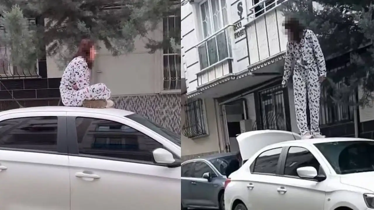 Yaşanan anlar çevrede bulunan vatandaşlar tarafından cep telefonu kamerasıyla saniye saniye kaydedildi. Görüntülerde, kadının otomobilin kaputuna uzandığı ve ardından aracın üzerine çıkarak dengesiz hareketler yaptığı görüldü.