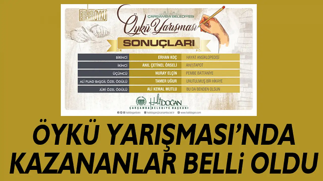 Çarşamba Belediyesi tarafından, “Gelenekte Öykü Gelecekte Öykü” sloganı ile 14 Şubat Dünya Öykü Günü’nde başlatılan ve Türkiye’nin dört bir tarafından 600’den fazla eserin katıldığı ‘Çarşamba Belediyesi Öykü Yarışması’nın sonuçları açıklandı. Yarışmanın kazananı “Hayat Ansiklopedisi” adlı öyküsüyle Erhan Koç oldu.