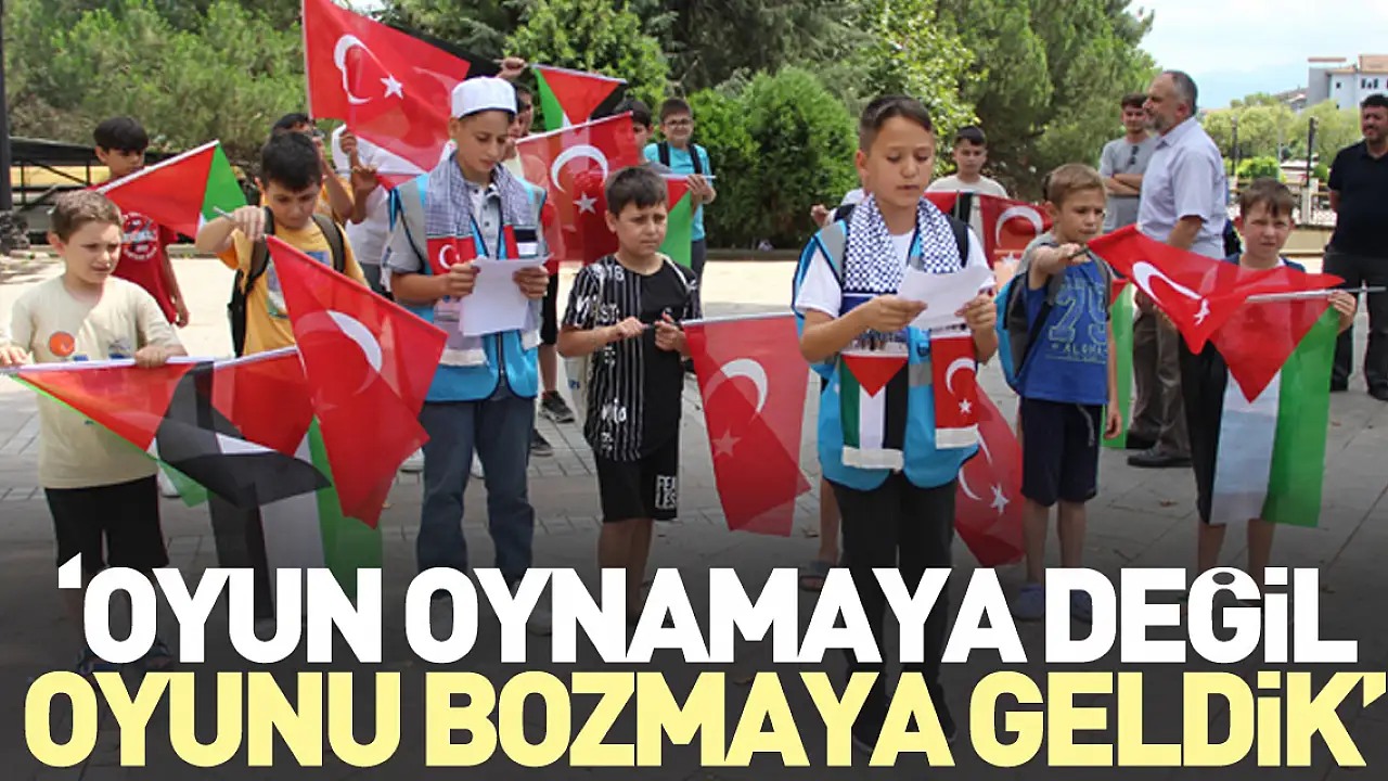‘Şimdi oyun zamanı’ diyerek devam eden öğrenciler; “Bu oyunda alışveriş yaparken paralarımız hiçbir zaman zalimlere gitmeyecek. Bu oyunda, İsrail’i çok seven Amerika, ona “oynaması” için kendi bahçesinden bir yer verecek. Bu oyunda, ümmetin bütün çocukları Mescid-i Aksa’nın bahçesinde özgürce oynayacak. Bu oyunda oyun yok, oyunu bozmak var! Şimdi biz çocuklar haykırıyoruz ve diyoruz ki: Biz oyuna değil, bozmaya geldik” diyerek sözlerini tamamladılar.