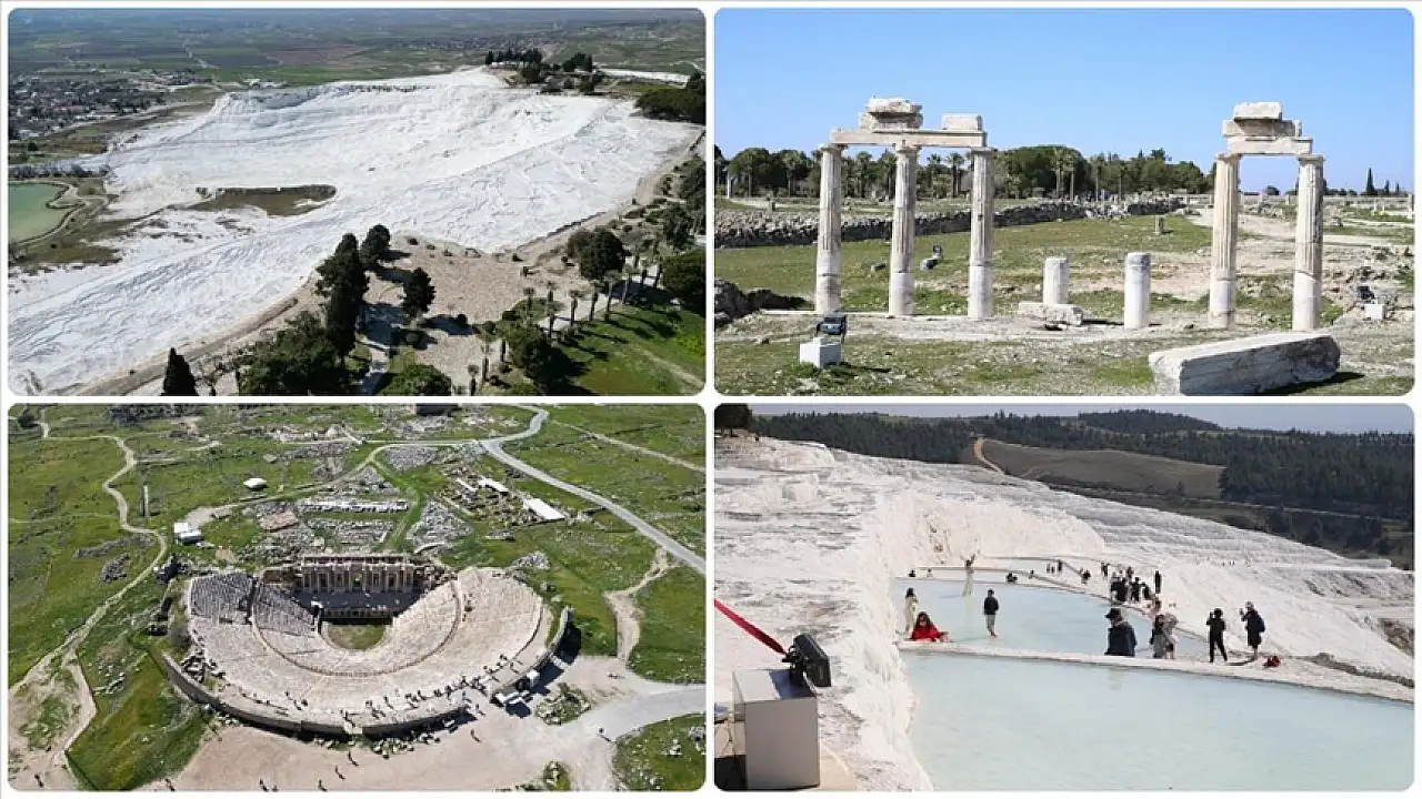 Gözde turizm merkezleri arasında yer alan Denizli'deki Pamukkale, her mevsim ilgi görüyor.Dünyanın dört bir tarafından gelenler, travertenleriyle benzersiz doğal güzelliğe sahip Pamukkale'de, geçmişi 2 bin 200 yıl öncesine uzanan Hierapolis Antik Kenti'nde tarihle iç içe vakit geçiriyor.Antik kentteki hamam-bazilika, tiyatro, Apollon Tapınağı, su kanalları, kiliseler, bölgenin doğal güzelliklerini tarihin mirasıyla harmanlıyor.Beyaz travertenlerde yürüyen, sıcak su dolu havuzlara girenler, çektikleri fotoğraf ve videolarla bu anlarını unutulmaz kılıyor.