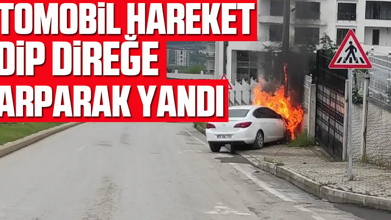 Samsun'da park halindeki bir otomobil rampa aşağı hareket ederek beton elektrik direğine çarpması sonucu alev alarak yandı.