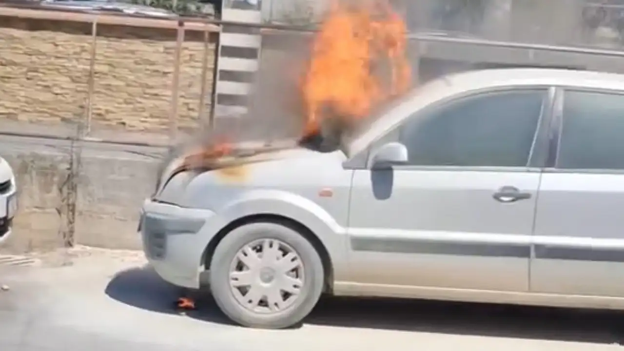 Hatay'ın İskenderun ilçesinde park halindeyken yanan otomobil paniğe neden olurken o anlar anbean cep telefonu kamerasına yansıdı.