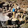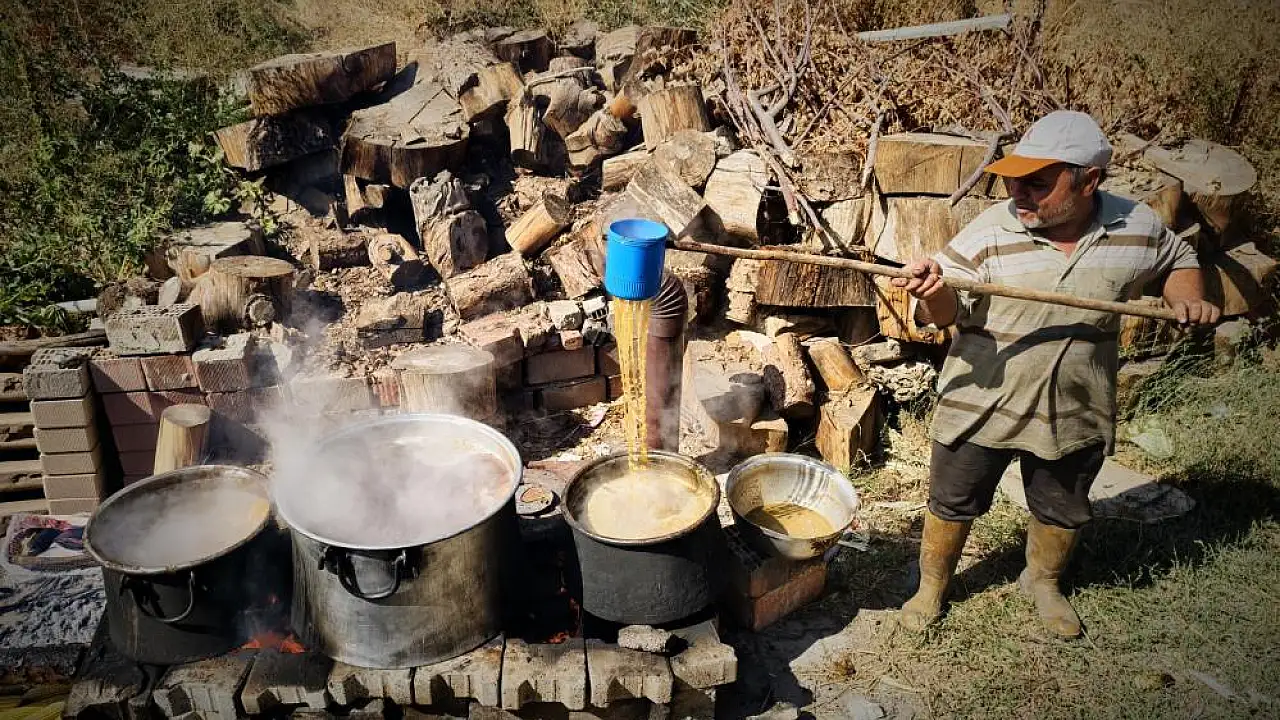 Manisa'nın Gördes ilçesine bağlı Güneşli Mahallesinde, kahvaltılarda sofraları süsleyen pekmez yapımı için gece gündüz kazanlar kaynatılıyor.