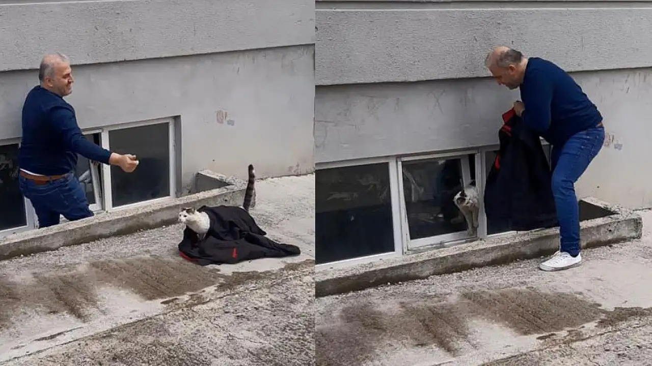 Kediyi kurtaran Fatih Sağlam, ”Orada bir kadın ‘pencerenin orada kedi sıkışmış. Sesini de duyuramıyor. Kurtarabilir misin' dedi. O evin altına girmiş. Birkaç gündür oradaymış, sesi geliyormuş. Çıksın diye camı açmışlar. Oradan çıkmaya çalışırken pencerenin arasına sıkışmış. O yüzden de agresifti. Montumla yaklaşarak kediyi tutup çıkardım. Kedide de bende de bir zarar olmadı” dedi.