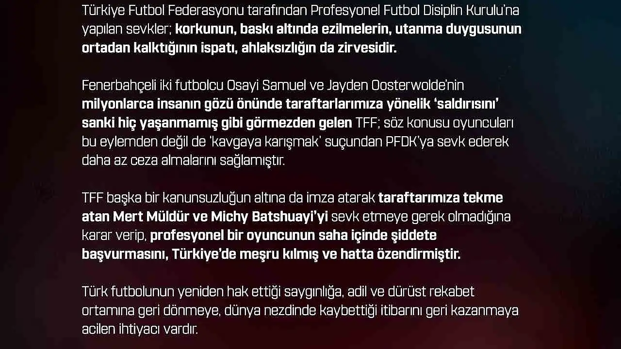 Fenerbahçeli iki futbolcu Osayi Samuel ve Jayden Oosterwolde’nin milyonlarca insanın gözü önünde taraftarlarımıza yönelik ‘saldırısını’ sanki hiç yaşanmamış gibi görmezden gelen TFF; söz konusu oyuncuları bu eylemden değil de ‘kavgaya karışmak’ suçundan PFDK’ya sevk ederek daha az ceza almalarını sağlamıştır. TFF başka bir kanunsuzluğun altına da imza atarak taraftarımıza tekme atan Mert Müldür ve Michy Batshuayi’yi sevk etmeye gerek olmadığına karar verip, profesyonel bir oyuncunun saha içinde şiddete başvurmasını, Türkiye’de meşru kılmış ve hatta özendirmiştir.
