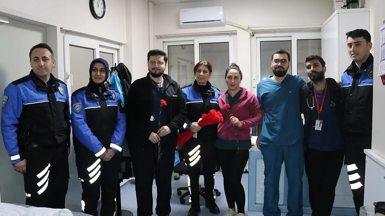 Polis ekipleri, tüm katları gezerek sağlık çalışanlarına karanfil verdi.