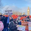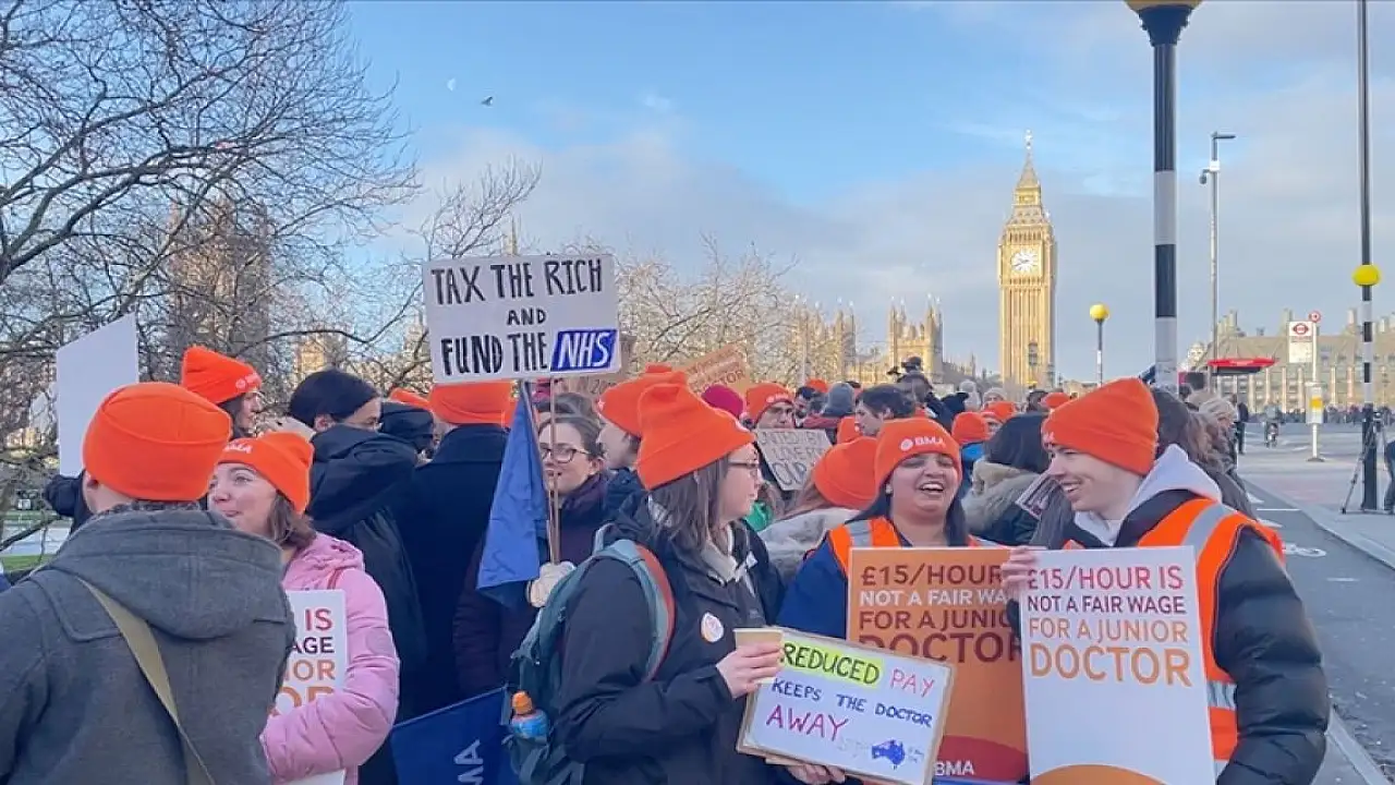 Londra'nın St. Thomas Hastanesi önünde toplanan İngiliz Tabipler Birliği (BMA) üyesi pratisyen hekimler, 2008 yılından bu yana aldıkları enflasyonun altında kalan zamları, hükümetin uzlaşmaz yaklaşımını ve yeterli seviyede personel bulunmamasını protesto etti.