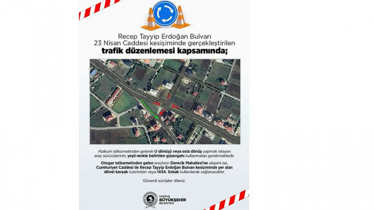 Samsun Büyükşehir Belediyesi, Recep Tayyip Erdoğan Bulvarı ile 23 Nisan Caddesi kesişiminde gerçekleştirilen kavşak düzenlemesinin ardından sürücülere yönelik yeni trafik akışına ilişkin bilgilendirmede bulundu.