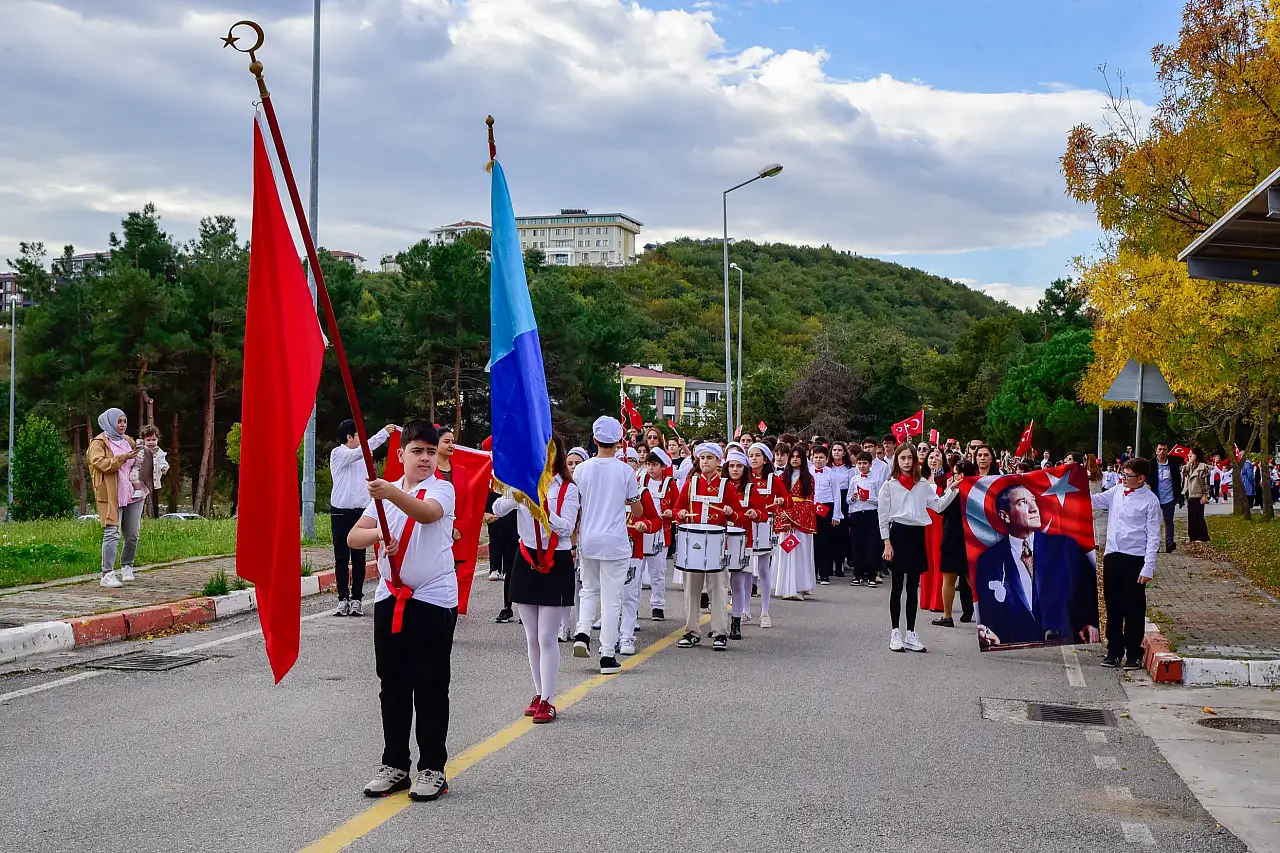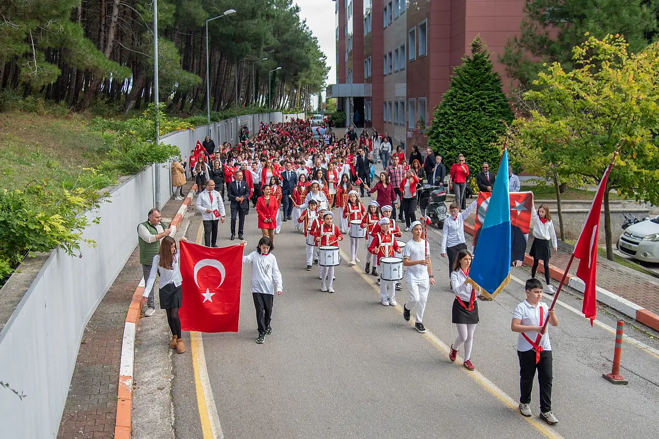 Cumhuriyet’in 102. yılı kapsamında düzenlenen yürüyüşte öğrenciler, ellerinde Türk bayrakları ve Atatürk posterleriyle marşlar söyledi.
