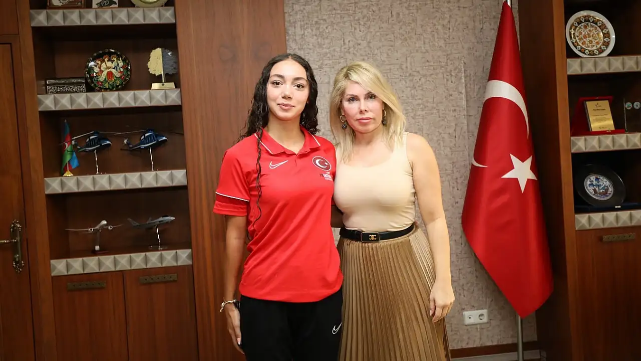 Akdeniz Üniversitesi Rektörü Prof. Dr. Özlenen Özkan, Mersin'de düzenlenen Avrupa Triatlon Kupası yarışlarında gençler kategorisinde şampiyon olan milli triatlet Selinay Tuğçe Kır ile bir araya geldi.