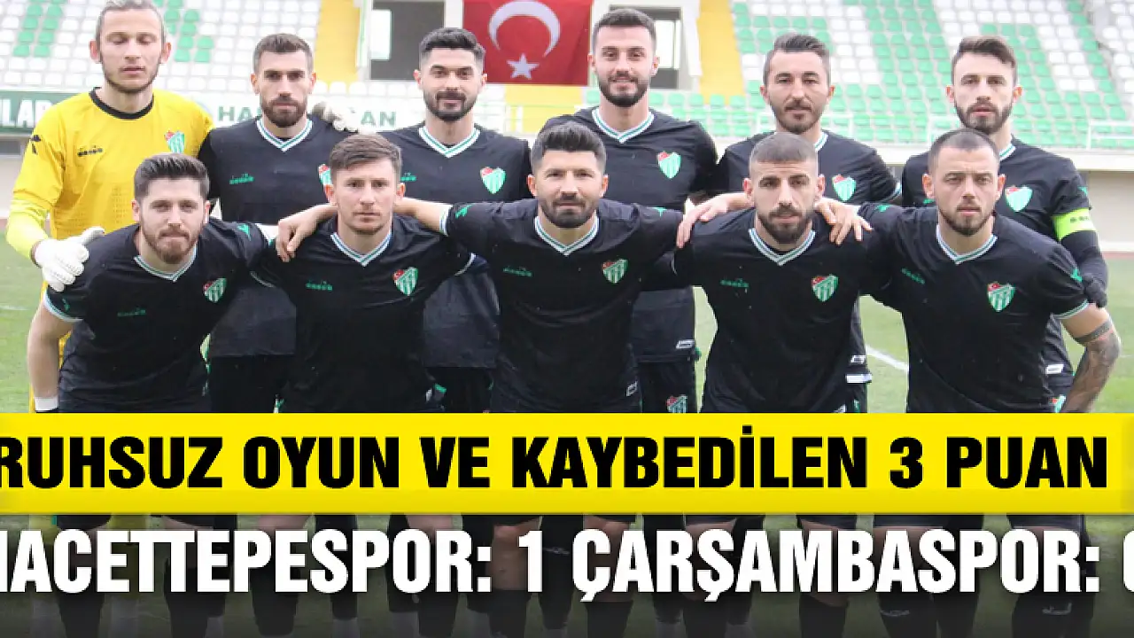 TFF 3. Lig 2. Grupta mücadele veren ve düşme hattından çıkmak için en net ve mutlak kazanması gereken Çarşambaspor, Ligin 25. haftasında deplasmanda en yakın rakibi Hacettepe Spor ile karşı karşıya geldi. Ankara Yeni Mahalle Hasan Doğan Stadyumunda oynanan müsabakada daha istekli ve arzulu ve 3 puan için mücadelesini ilk dakikadan itibaren sahaya yansıtan Hacettepe spor takım oyuncuları ilk dakikalardan itibaren baskılı oyunu ile mücadeleye başladı. Yeşil Beyazlı takım oyuncuları ise anlaşılmaz şekilde kendi yarı alanına çekilerek korkak futbolu ile resmen gol yemek için beklediler. Hiçbir atak düşünmeyen yeşil beyazlılarda üç değil, iki pas dahi yapamayan takım kadrosu mücadele ediyor görüntüsü verirken maçın 35. dakikada rakip takım Hacettepe Spor'un oyuncusu Veli Ortakçı’nın 35. dakikada attığı çektiği şut Kaleci Kadir’in yine savruk oyunu sayesinde kalemiz fileleri ile buluştu ve böylece rakip takım bir anda beklemediği golle durumu 1-0 öne getirdi. Bu golden sonra toparlanması beklenen Çarşambaspor kadrosunda hiçbir şey değişmeyince ilk yarı rakibin kendi evinde attığı tek golle 1-0 sona erdi ve iki takımda bu şekilde soyunma odasına gitti.