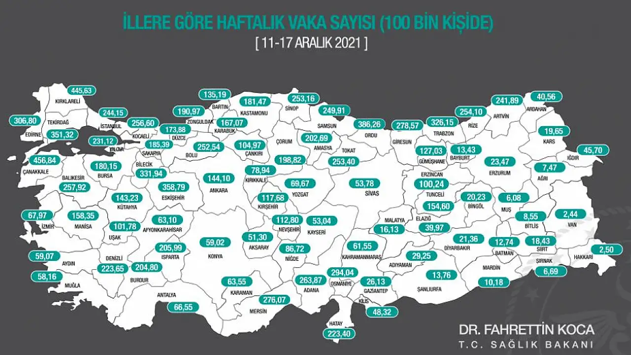 Sağlık Bakanı Fahrettin Koca, 11-17 Aralık arasında illere göre her 100 bin kişide görülen koronavirüs vaka sayılarını açıkladı.