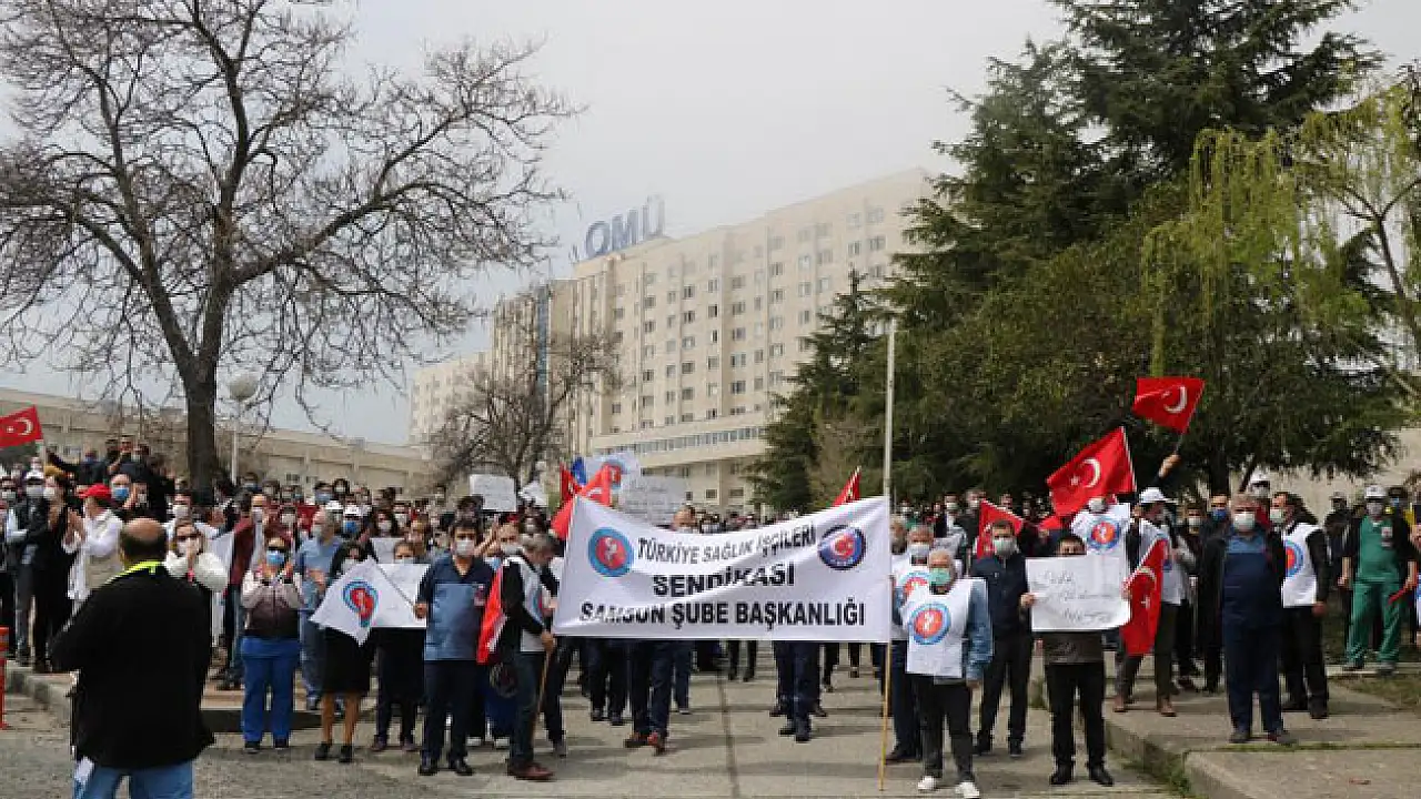 Ondokuz Mayıs Üniversitesi’nde (OMÜ) görevli sağlık çalışanları, 3 yıldır zam ve enflasyon farkı alamadıkları ve maaşlarının diğer kurumlarda çalışan personellerden düşük olduğunu belirterek yürüyüş düzenledi. Sağlıkçılar, Tıp Fakültesi Dekanlığı önünden ellerindeki döviz ve pankartlarla sloganlar eşliğinde rektörlük binasına kadar yürüdü.