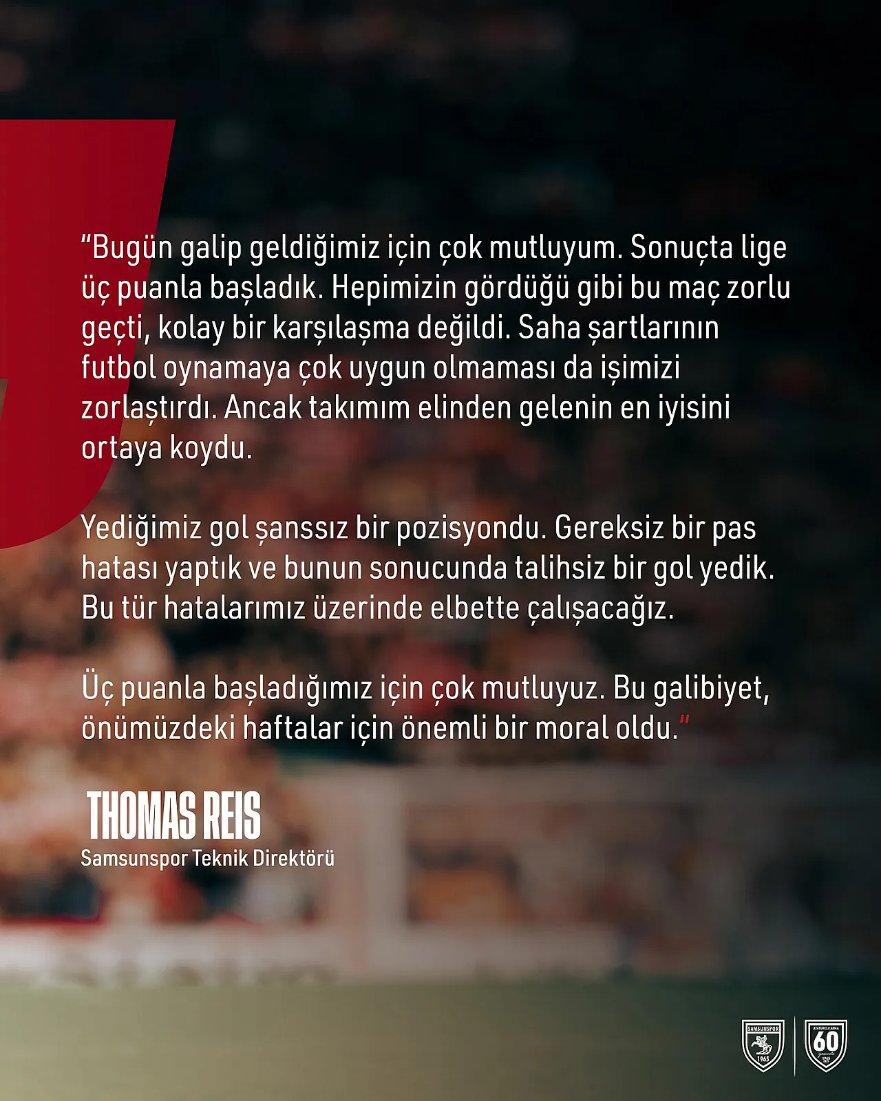 Samsunspor Teknik Direktörü Thomas Reis, Süper Lig'in ilk haftasında Gençlerbirliği karşısında alınan 2-1'lik galibiyetin ardından, zorlu saha şartlarının galibiyeti daha da değerli kıldığını söyledi.