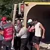 Sakarya'nın Kocaali ilçesinde sürücüsünün kontrolünden çıkan hafriyat kamyonu yola devrildi. Yaralı sürücünün araçtan çıkarılma anları cep telefonu kamerasına yansıdı.