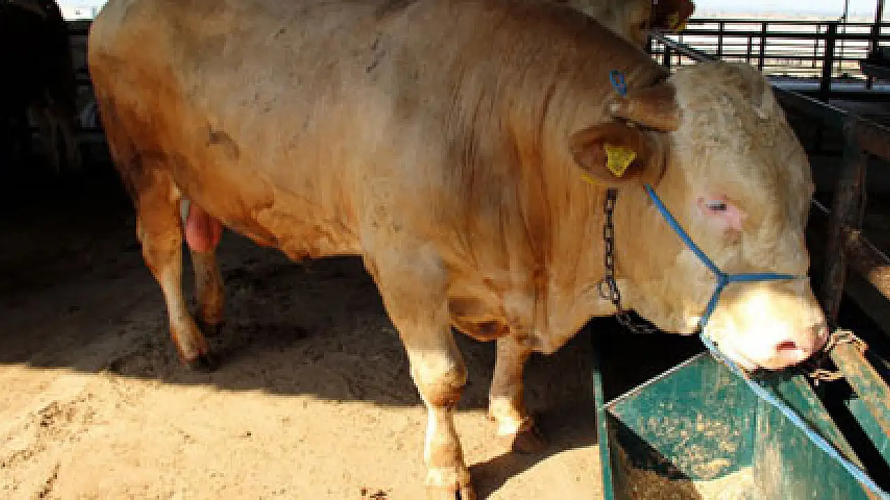 Manisa'da, canlı hayvan borsasında ağırlığı bir tona yaklaşan 15 bin TL değerindeki 'Şampiyon' isimli Şarole cinsi boğa alıcısını bekliyor.