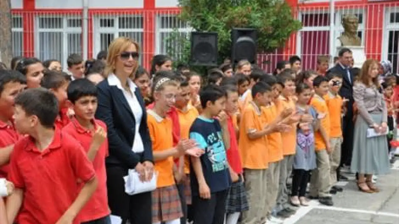 Vali Yardımcısı Ramazan Aksoy ve Milli Eğitim müdürü Hülya Ertürk Koç, Atatürk İlköğretim Okulu öğrencilerinin karnelerini verdi.