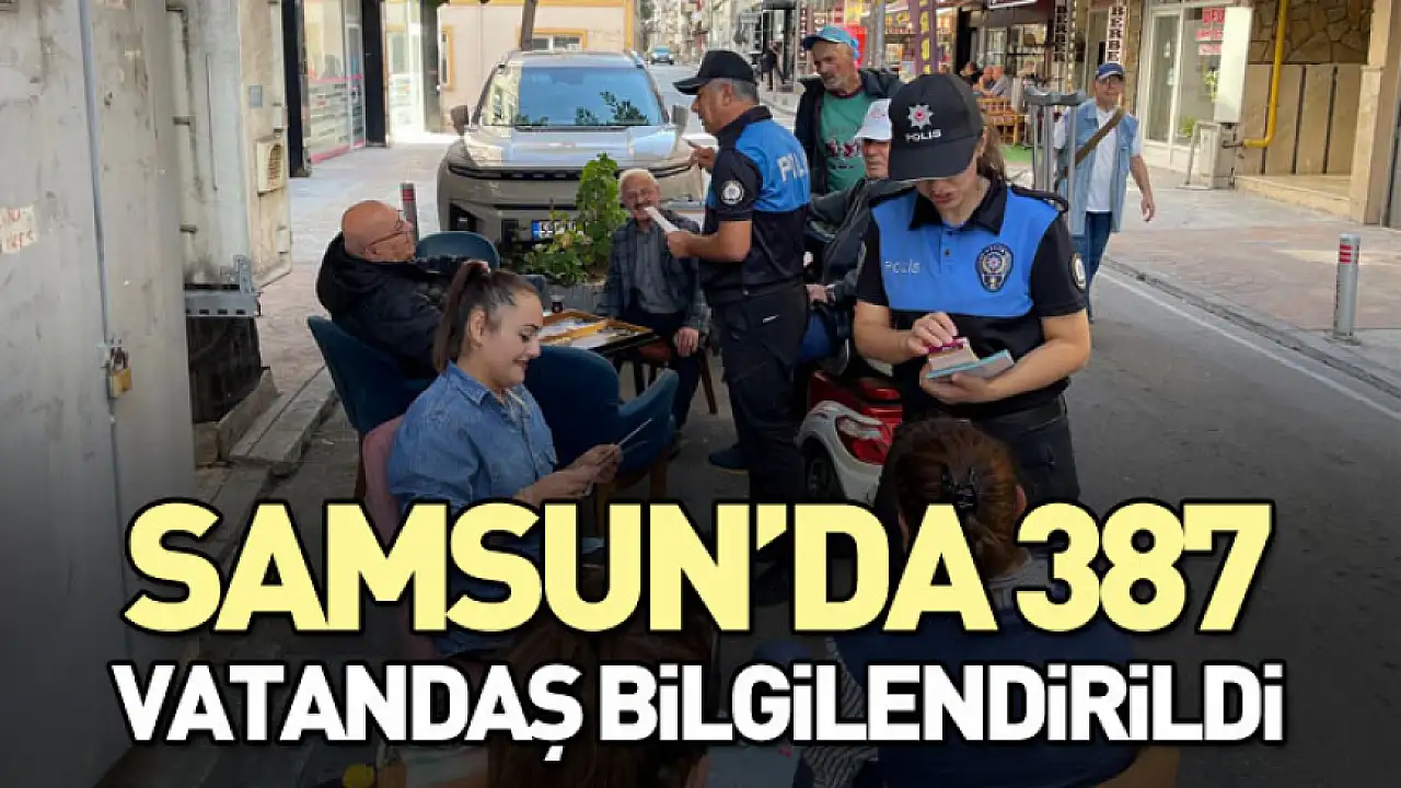 Samsun'da Toplum Destekli Polislik Şube Müdürlüğü ekipleri, vatandaşların güvenliğini sağlamak için sahada bilgilendirme faaliyetlerini sürdürüyor. Bu kapsamda yapılan çalışmalar neticesinde toplam 387 vatandaş bilgilendirildi.