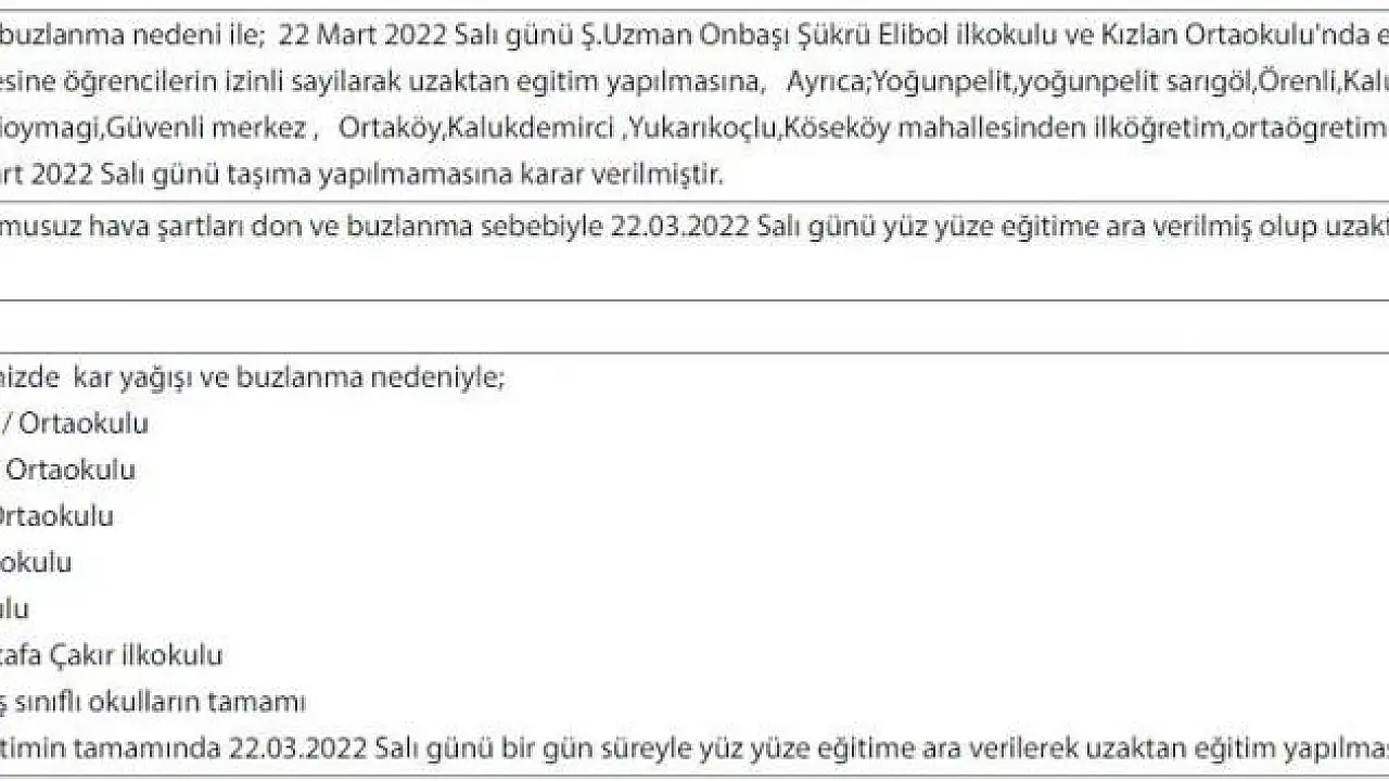 Samsun İl Milli Eğitim Müdürlüğü kar yağışı ve buzlanma nedeniyle 22 Mart Salı günü eğitim-öğretime ara verilecek okulları duyurdu. Asarcık ilçesinde tüm okulların yüz yüze eğitime ara vereceği belirtilen açıklamada Ladik ilçesinde taşımalı sistem kapsamında olan mahallelerden taşıma yapılmayacağı ve öğrencilerin izinli sayılacağı ifade edildi.