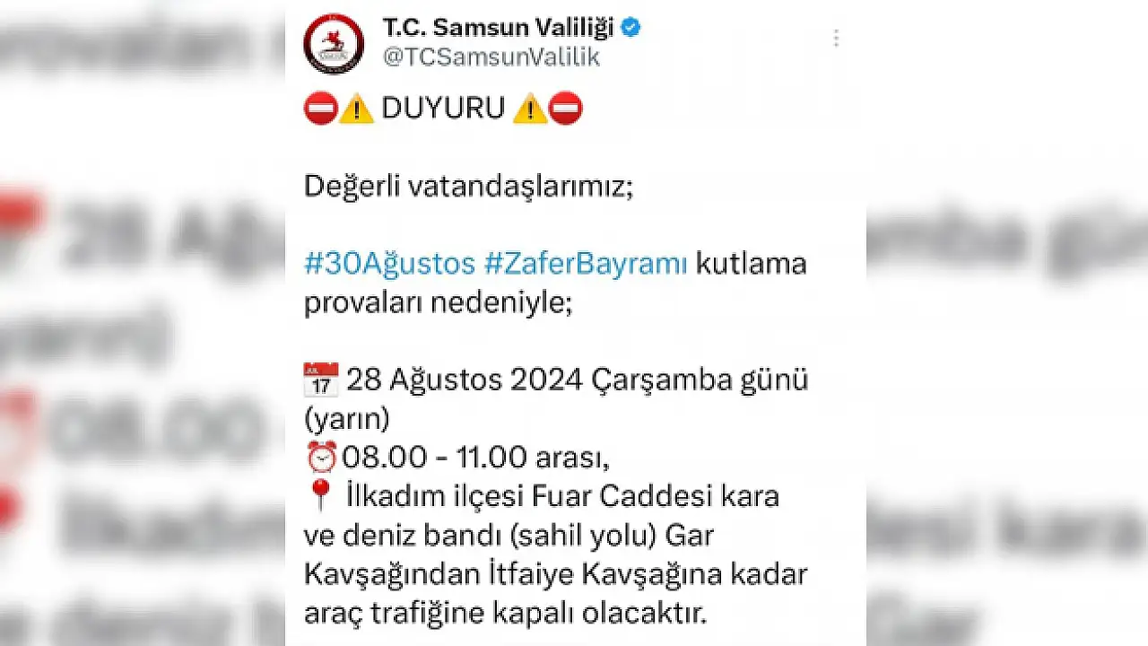 Valilikten yapılan açıklamada, "Değerli vatandaşlarımız; 30Ağustos Zafer Bayramı kutlama provaları nedeniyle 28 Ağustos 2024 Çarşamba günü 8 -11 saatleri arası, İlkadım ilçesi Fuar Caddesi kara ve deniz bandı (sahil yolu) Gar Kavşağından İtfaiye Kavşağına kadar araç trafiğine kapalı olacaktır" ifadeleri kullanıldı.