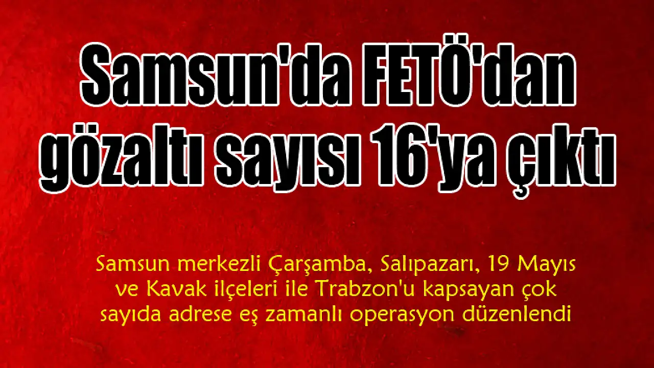 Samsun Emniyet Müdürlüğü Kaçakçılık ve Organize Suçlarla Mücadele (KOM) Şube Müdürlüğü ekipleri, Fetullahçı Terör Örgütü/Paralel Devlet Yapılanması (FETÖ/PDY) soruşturması kapsamında bu sabah Samsun merkezli Çarşamba, Salıpazarı, 19 Mayıs ve Kavak ilçeleri ile Trabzon'u kapsayan çok sayıda adrese eş zamanlı operasyon düzenlendi. Operasyon kapsamında çoğunluğu FETÖ'nün müzahir kurum çalışanları, ihraç kamu görevlileri ve özel sektör çalışanlarından oluşan toplam 16 kişi "silahlı terör örgütüne üye olma" suçundan gözaltına alındı.