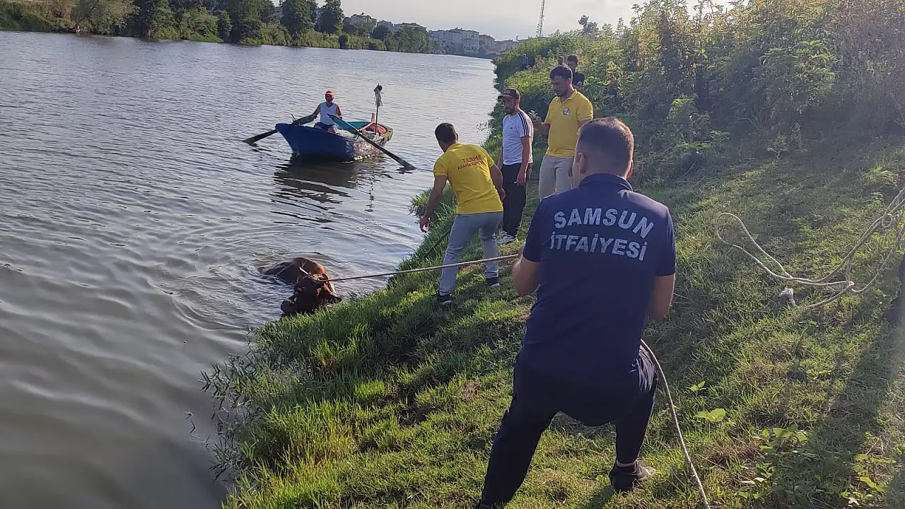 Samsun'un Terme ilçesinde ırmağa düşen inek, itfaiye ve arama kurtarma ekiplerinin çalışmasıyla kurtarıldı.