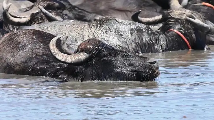 Samsun'da etkisini artıran kavurucu sıcaklardan bunalan mandalar, soluğu Kızılırmak Deltası Kuş Cenneti'nin serin sularında aldı. Ortaya çıkan kartpostallık görüntüler, doğanın sıcakla mücadelesini gözler önüne serdi.