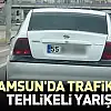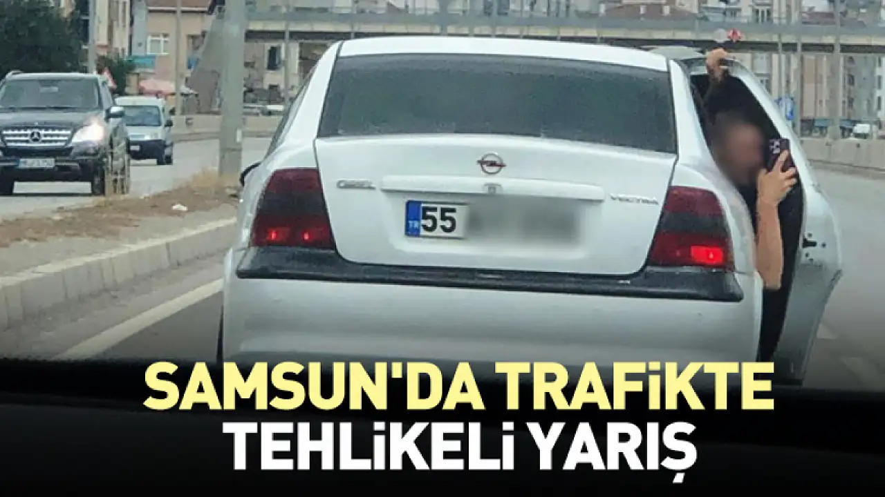 Samsun'da seyir halindeyken yarış yapan bir otomobildeki yolcu, arka kapıyı açarak hem tehlikeli şekilde yolculuk yaptı hem de yarıştıkları araçların videosunu çekti.
