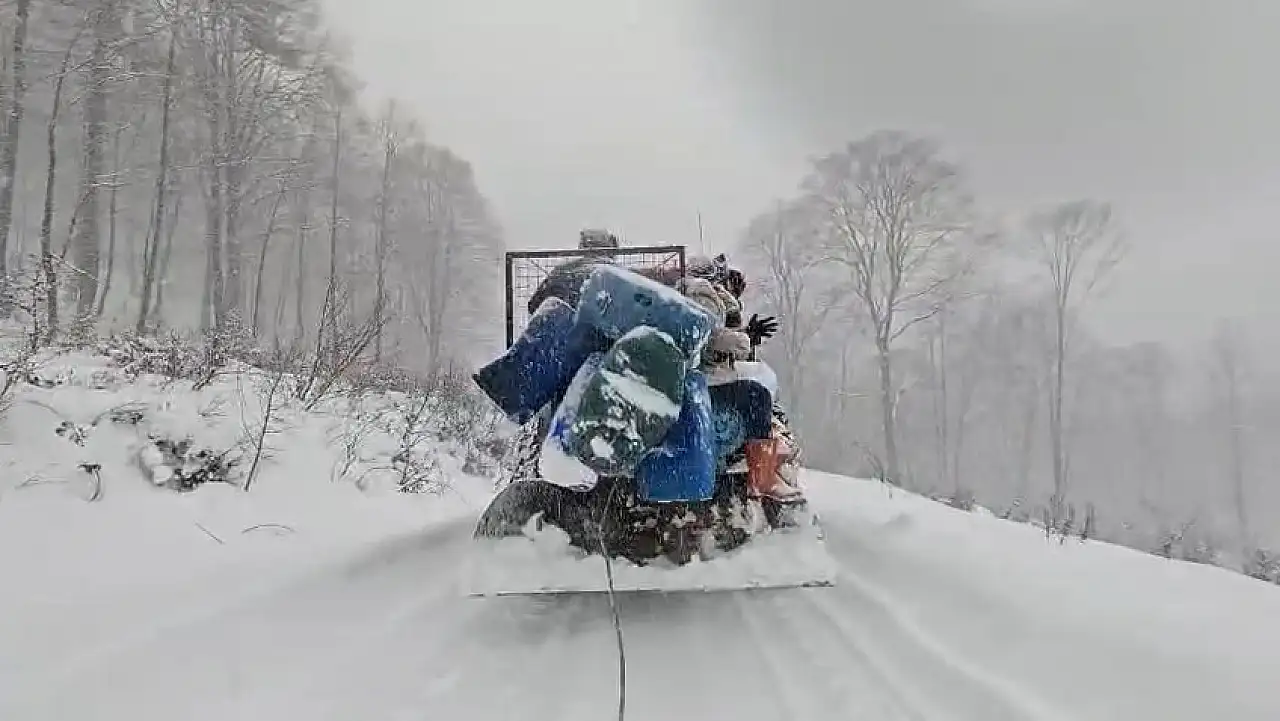 Bir kişi, traktörün arkasına kızak bağlayarak kayarken, çevredeki vatandaşlar bu anları şaşkınlık ve keyifle izledi. Bölgede çocuklar ve yetişkinler, karın tadını çıkarttı.