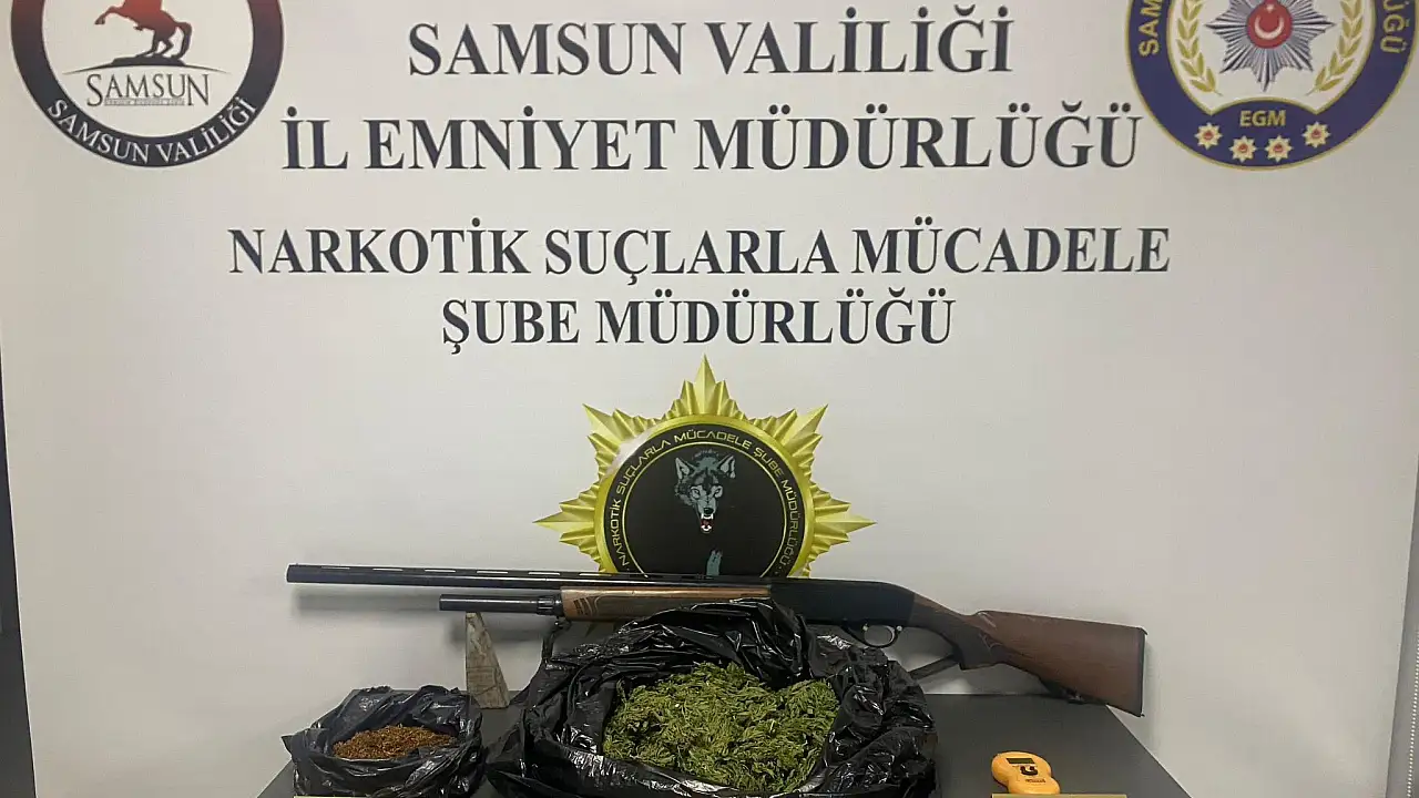 Samsun Emniyet Müdürlüğü Narkotik Suçlarla Mücadele Şube Müdürlüğü ekiplerinin yürüttüğü çalışmalar kapsamında durdurulan araç ve bağlantılı adreste yapılan aramalarda 448,64 gram esrar, 94,50 gram sentetik kannabinoid (bonzai), 1 adet ruhsatsız tüfek ve 1 adet hassas terazi bulundu.