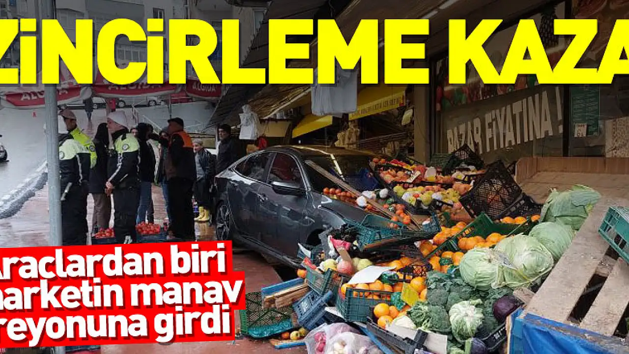 Samsun'da 3 aracın karıştığı zincirleme trafik kazasında araçlardan biri yoldan çıkarak marketin manav reyonuna girdi.