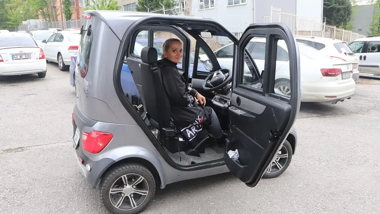 Samsun İl Sağlık Müdürlüğü'nde hemşire olarak çalışan 44 yaşındaki Nurgül Yanak, engeli dolayısıyla elektrikli mini bir araç satın aldı. Satın aldığı aracın 2,3 metre uzunluğunda olması, diğer araçların yanında oldukça minik durması ise dikkat çekiyor. Aracını görenlerin sürekli fotoğraf çektirdiği belirten Nurgül Yanak, aynı zamanda aracın çevreye de kirli hava vermediğini söyledi.