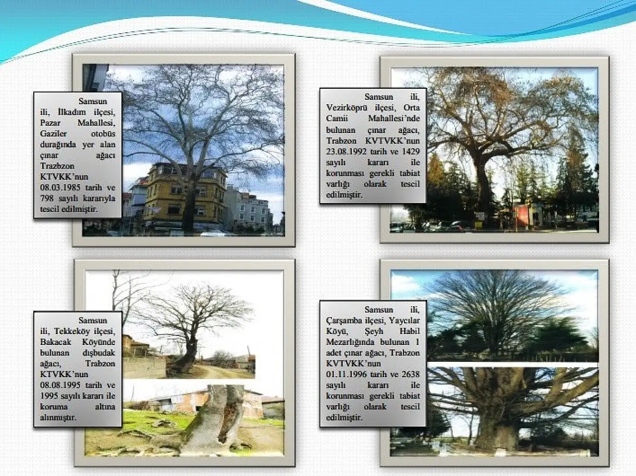 Trabzon Kültür Varlıklarını Koruma Bölge Kurulu Müdürlüğü tarafından Samsun genelinde 11 anıt çınar ağacı tescil edilerek koruma altına alındı. Bu ağaçlar arasında en dikkat çekenlerden biri ise İlkadım ilçesi Kale Mahallesi’nde bulunan dev çınar ağacı oldu.